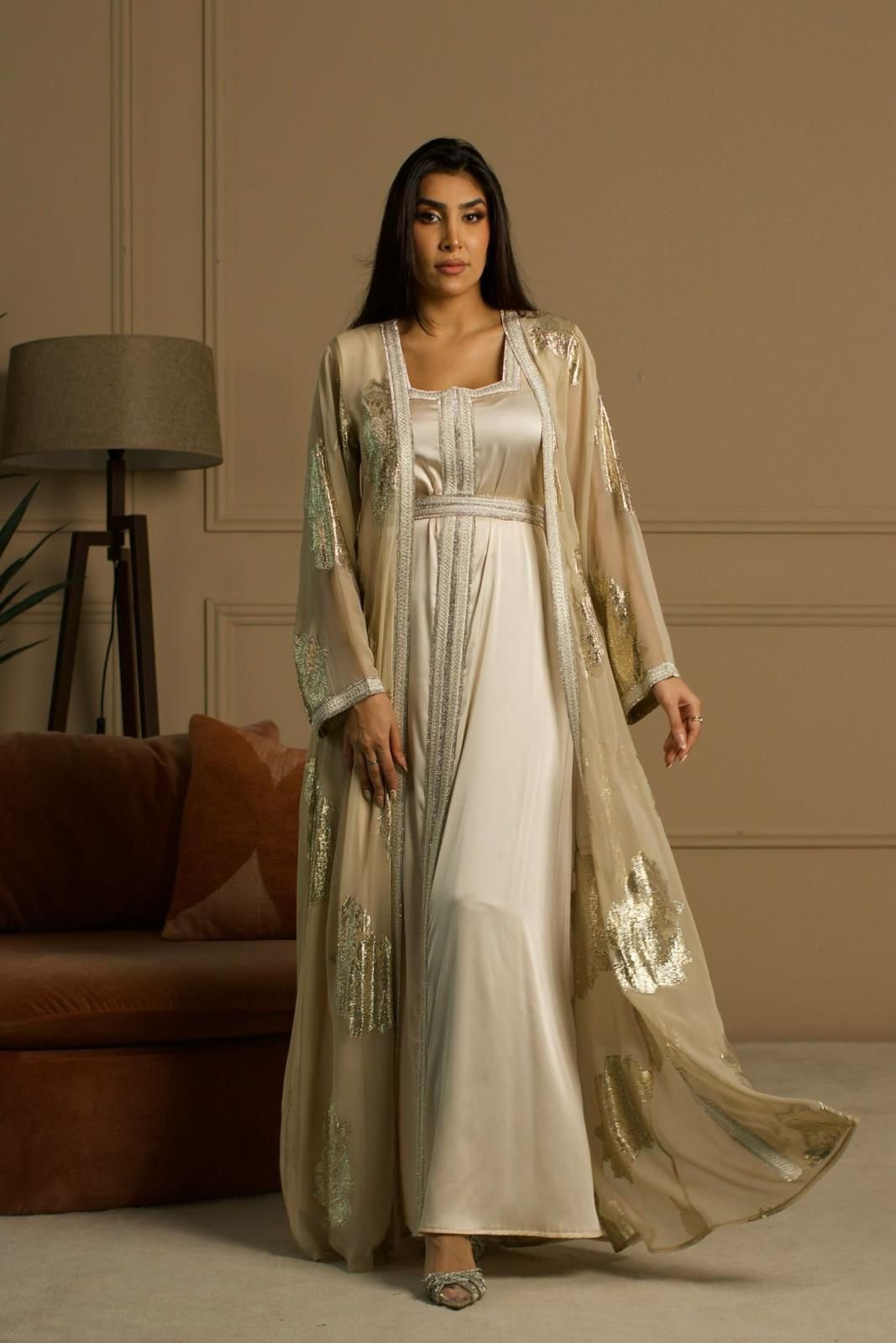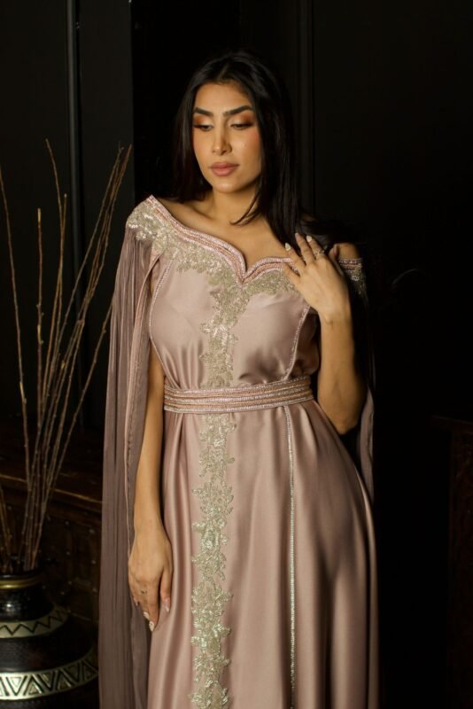 جلابية سهرة بلون موكا بتطريز ذهبي ناعم