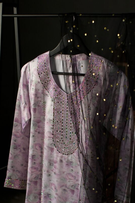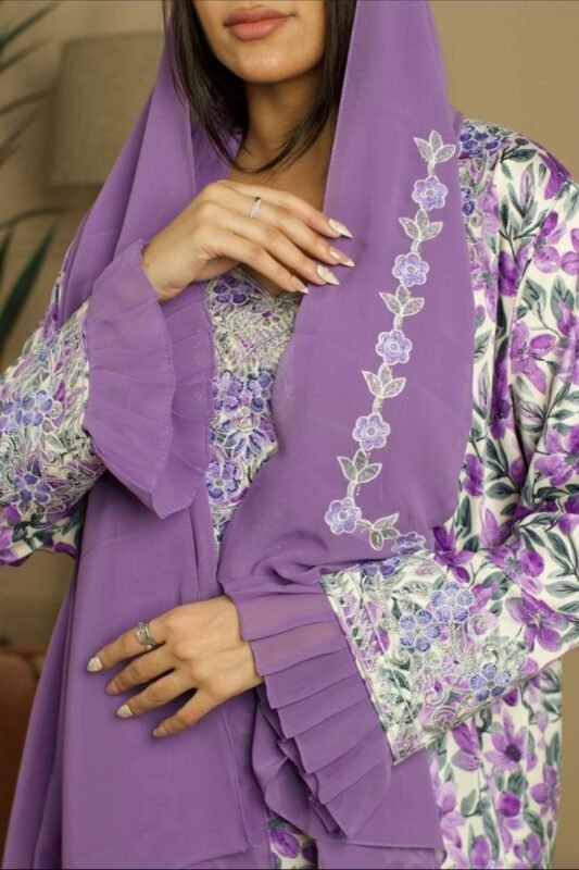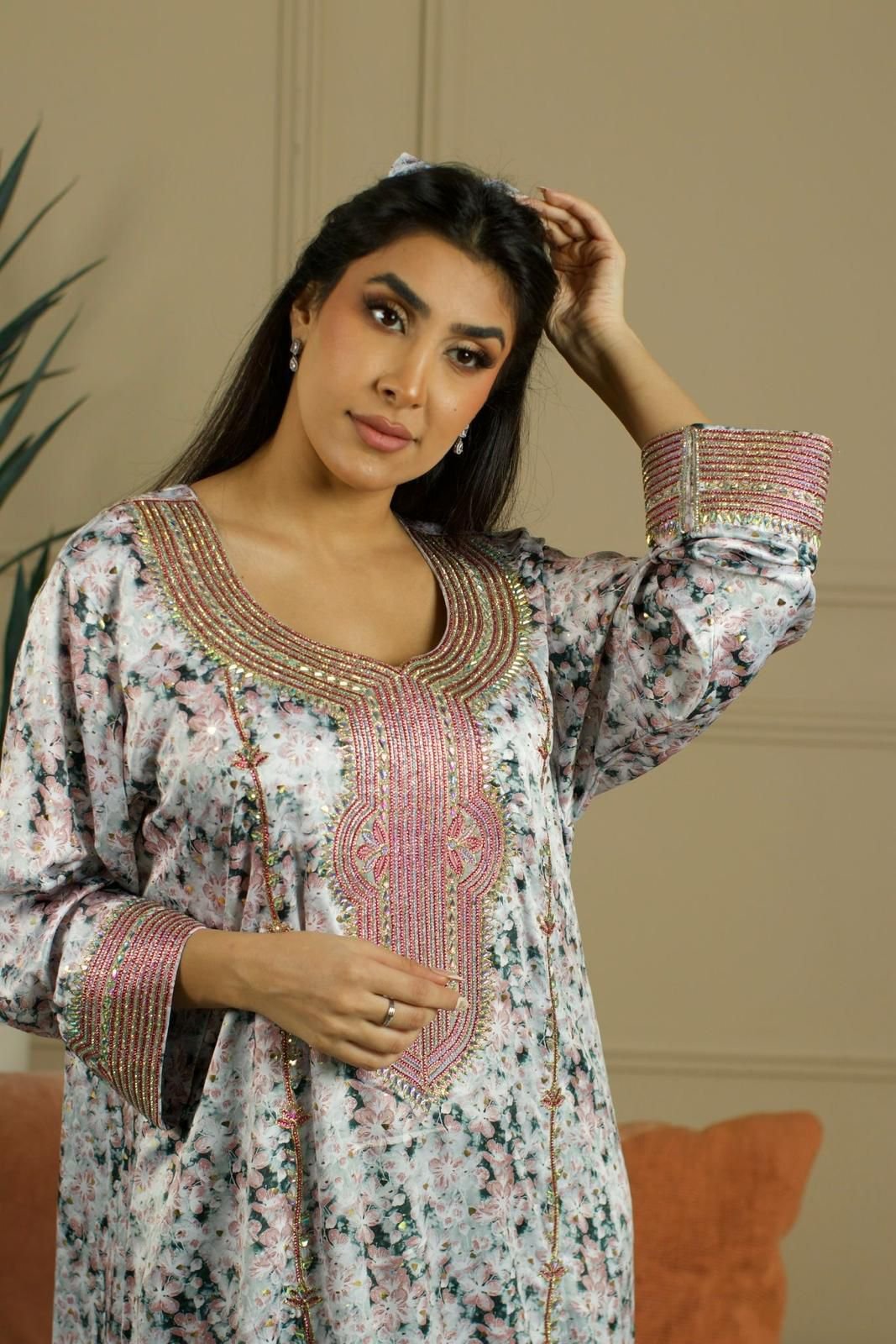جلابية نسائية فاخرة مطرزة مع شيلة تول منقط