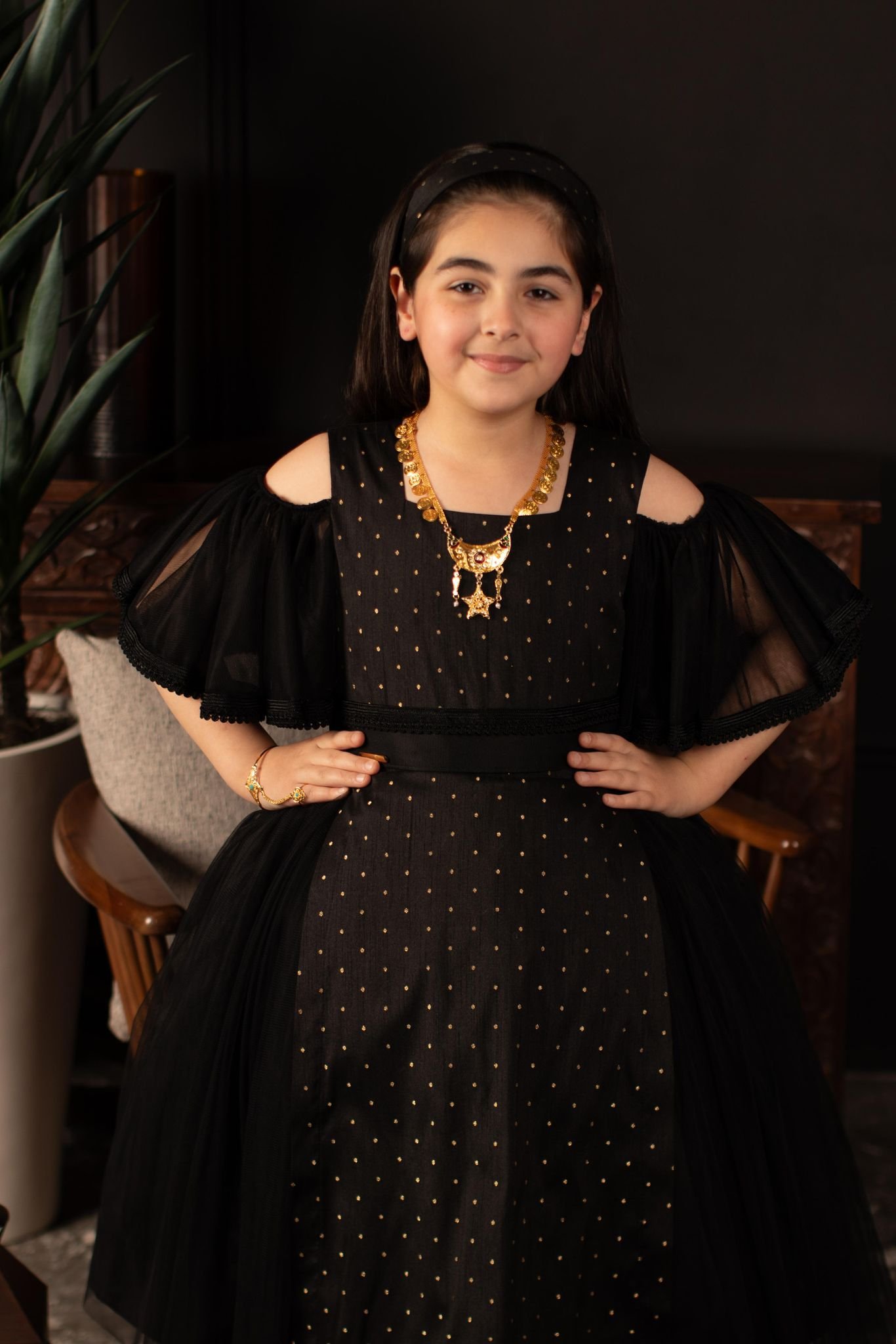 فستان أنيق بلون أزرق ملكي فاخر مزين بنقاط ذهبية ناعمة تعكس لمسة راقية وملكية. يتميز بأكمام شيفون واسعة وانسيابية مع تنورة بطبقات تول تعطي حجم جميل وحركة أنثوية جذابة. مثالي للمناسبات، الأعياد، وحفلات المدارس.